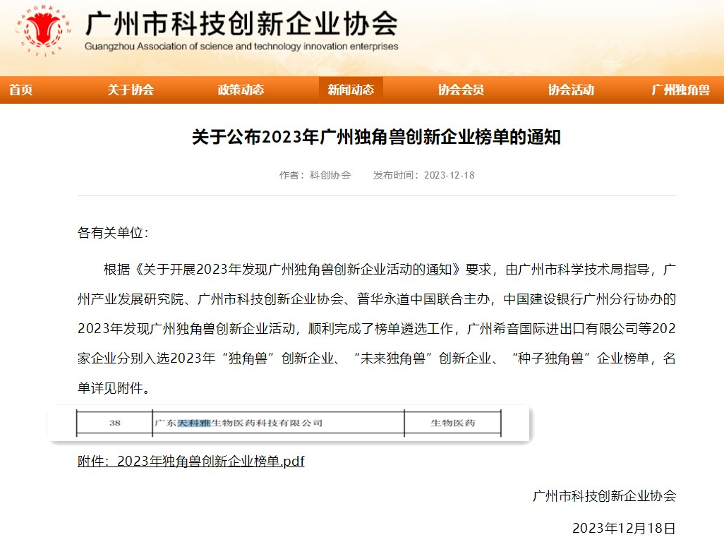根據(jù)廣州市科技創(chuàng)新企業(yè)協(xié)會網12月18日《關于公布2023年廣州獨角獸創(chuàng)新企業(yè)榜單的通知》內容所示,天科雅入選2023年“未來獨角獸”創(chuàng)新企業(yè)榜單。