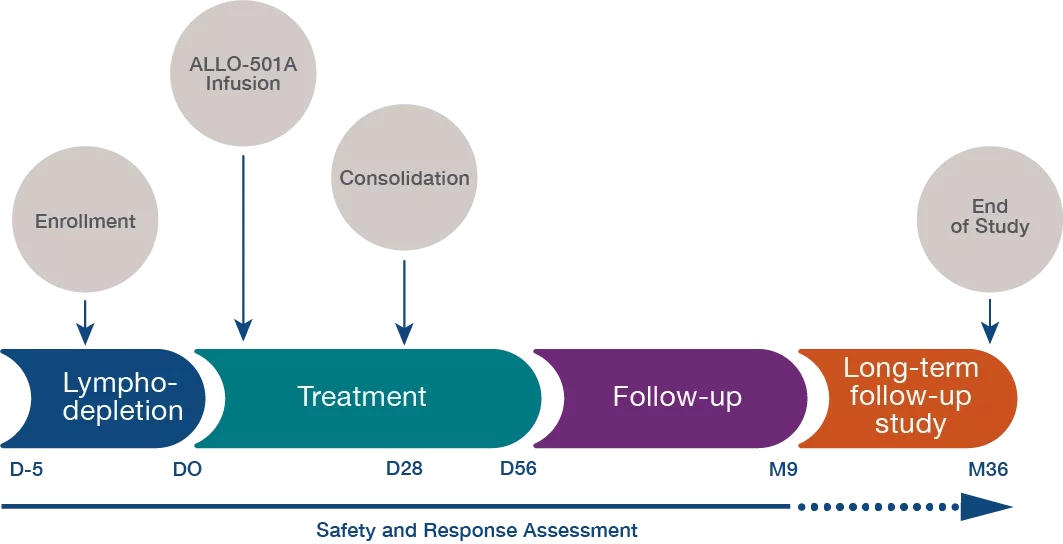 ALLO-501A是基于AlloCAR TTM的首批在研產(chǎn)品之一。該療法為抗CD-19 AlloCAR TTM。2020年6月,ALLO-501A開始了ALPHAI/II期臨床。