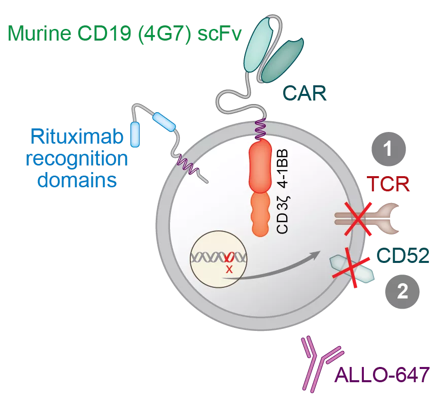 為了減少或杜絕移植物抗宿主病(GVHD)和異基因排斥風(fēng)險,Allogene會對CAR-T細(xì)胞進(jìn)行基因編輯,敲除T細(xì)胞受體基因。此外,Allogene還開發(fā)了一款抗CD52單抗ALLO-647用于抑制宿主免疫系統(tǒng),以支持AlloCAR TTM的持續(xù)治療,達(dá)到充分療效。