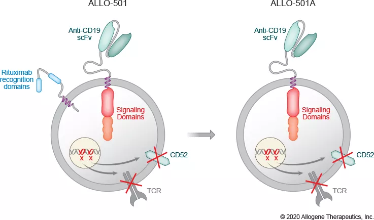 ALLO-501A是ALLO-501的進(jìn)化產(chǎn)品,其區(qū)別在于消除了ALLO-501中利妥昔單抗識別域。