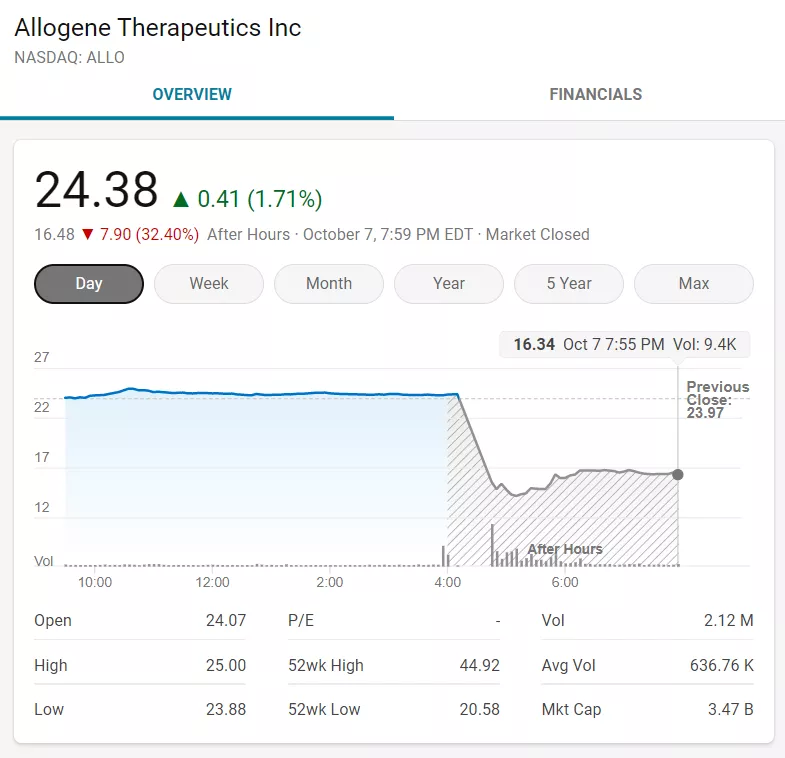 受此利空影響,Allogene盤后暴跌超30%,市值蒸發(fā)10億美元。